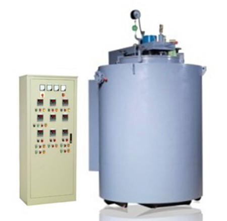 井式气体氮化炉采用节能炉衬双水冷炉罐盖,真空橡胶密封以及上下二区或多区控温。使氮化炉保温性、炉温均匀性、密封性、渗氮速度都有很大提高,炉型与国际标准一致。本系列井式气体氮化炉的外壳由钢板及型钢焊接而成,炉衬由超轻质,高强度节能耐火砖砌成,炉衬外层夹置硅酸铝纤维填充保温。加热元件由高温电阻丝绕成螺旋状,安装在炉衬的搁砖上,在炉膛中安有不锈钢真空罐。炉盖上安装有双头不锈钢滴注器供滴注甲醇,使氮化炉内温度气氛均匀。炉盖上装有排气管、炉罐侧壁上部的输入管可供氨气输入用,炉罐与炉盖采用水冷真空橡胶密封,并装有压紧螺拴。氮化炉内废气通过排气管排出炉外。