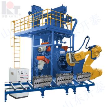 该机是山东开泰根据市场需求研制开发的新型高效机械手式抛丸清理机,机械手式抛丸机由两大部分组成,一个是工件进出料系统,另一个是抛丸室系统。机械手的夹紧装置可以适应性状,尺寸不同的铸件而不需要更换夹具,同事具有较好的溢丸性,使铸件得到彻底的清理.